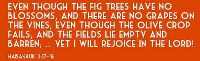 In the midst of a very discouraging day, the Lord reminded me of a passage from Habakkuk 3:17-19: “Though the fig tree should not blossom, and there be no fruit on the vines; though the yield of the olive tree fail, and the fields produce no food, though the flock should be cut off from the fold, and there be no cattle in the stalls, YET I WILL EXULT IN THE LORD, I WILL REJOICE IN THE GOD OF MY SALVATION. The Lord God IS my strength, and HE has made my feet like hind’s feet, and makes me walk in high places.”
